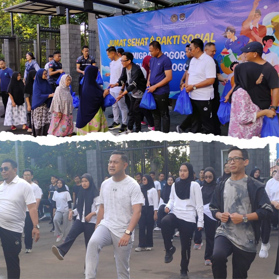 BRO. KOTA BOGOR – Kantor Imigrasi Kelas I Non TPI Bogor bersama Persatuan Wartawan Indonesia (PWI) Kota Bogor menggelar kegiatan Jumat Sehat dan bakti sosial di halaman kantor Imigrasi, Tanah Sareal, Jumat (5/12/2025) pagi. Usai olahraga bersama, kedua lembaga menyalurkan 40 paket sembako kepada warga sekitar yang membutuhkan.