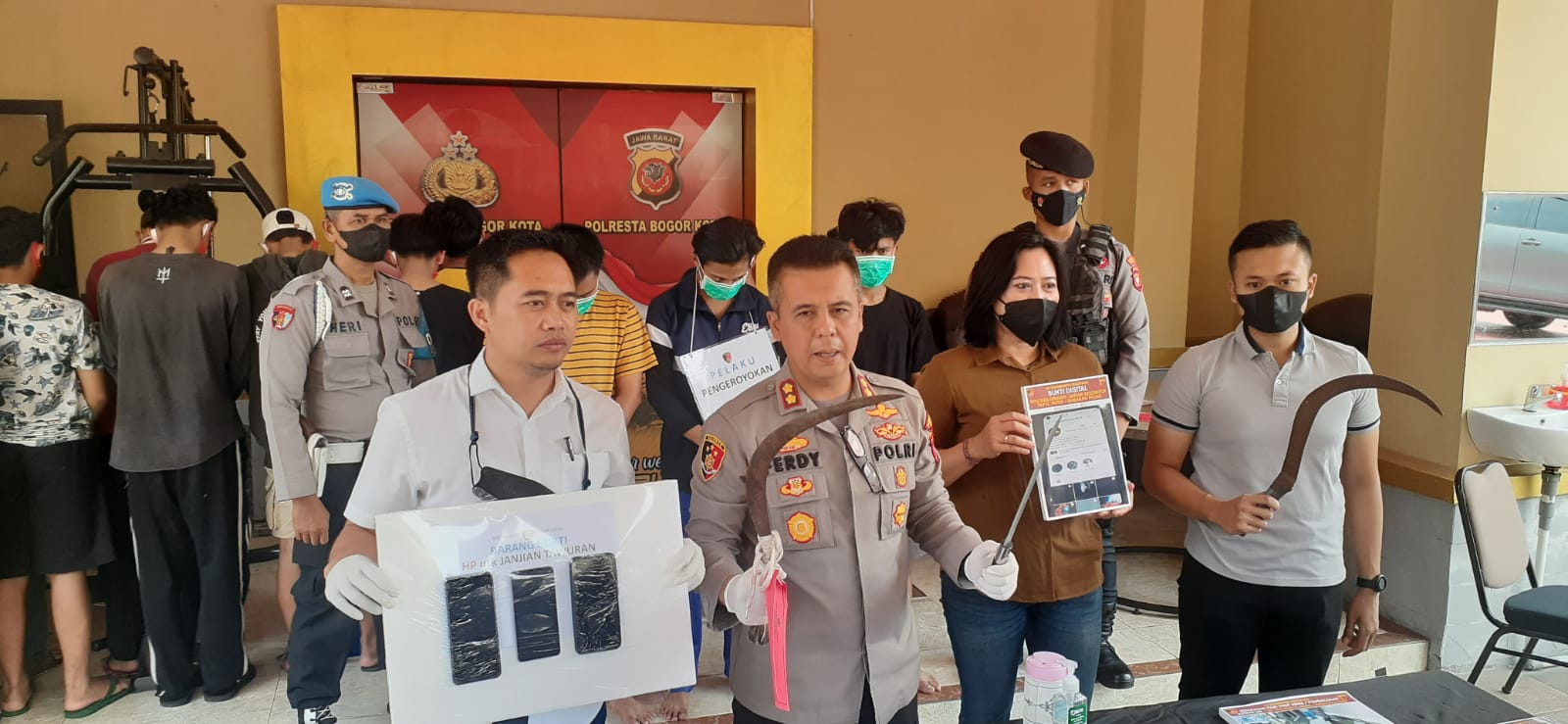Polisi juga mengamankan dua buah celurit, satu buah pedang, dan tiga unit handphone yang yang disita dari pelaku sebagai barang bukti.